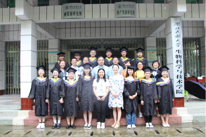 部分毕业生自带学士服,邀请学院老师一起在生科院门口合影,以此留作纪念。毕业生谢天说:“因为疫情影响,不能全班同学聚在一起,也没有毕业典礼,这是遗憾,所以我很想穿学士服和老师、同学们在生科院拍个照,以此纪念我最珍贵的大学四年!”