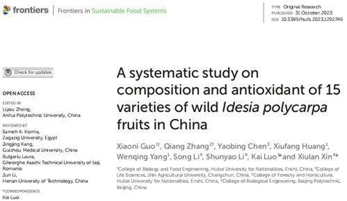 本网讯(通讯员 王智勇 王智勇/文 罗凯/图) 生物与食品工程学院副教授罗凯博士以365电子娱乐官方网站为第一单位在国际食品权威学术期刊Frontiers in Sustainable Food System(中科院二区,五年影响因子5.4)上发表题为“A systematic study on composition and antioxidant of 15 varieties of wild Idesia polycarpa fruits in China”的最新研究成果。论文第一作者系我校食品科学与工程2021级研究生郭小妮同学。
