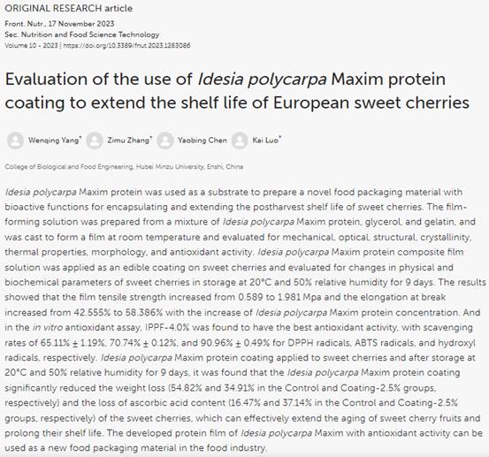 我院罗凯博士在​Frontiers in Nutrition发表论文:Evaluation of the use of Idesia polycarpa Maxim protein coating to extend the shelf life of European sweet cherries