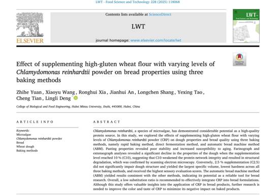 本网讯(通讯员 邓伶俐、原芝荷/文 原芝荷/图)近日,我院食品科学研究团队硕士研究生原芝荷以第一作者身份(通讯作者邓伶俐副教授)在食品领域权威期刊《LWT-Food Science and Technology》发表题为“Effect of supplementing high-gluten wheat flour with varying levels of Chlamydomonas reinhardtii powder on bread properties using three baking methods”的科学论文。该论文系统报道了莱茵衣藻粉(Chlamydomonas reinhardtii powder)在面包制作中的应用,并比较了不同烘焙方法对最终面包品质的影响,为开发营养强化面包提供了理论依据和技术支撑。该研究获国家自然科学基金(32160610)和365电子娱乐官方网站校内高水平科研项目XN24029资助。