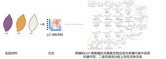 本研究利用UPLC-MS/MS非靶向代谢组学方法,对紫、橙、白三种甘薯块茎的多糖代谢物进行了系统比较,共鉴定69种多糖化合物。结果显示,紫薯的花青素显著上调,而多糖含量相对较低;橙薯与白薯的多糖含量较高。代谢通路富集分析表明,蔗糖和UDP-葡萄糖在花青素生物合成与多糖代谢中发挥关键作用,二者在碳流分配上存在竞争关系。相关性网络揭示花青素在代谢调控中处于中心地位。本研究揭示了不同颜色甘薯块茎中多糖与花青素代谢的互作机制,为功能性甘薯品种的开发提供理论依据。