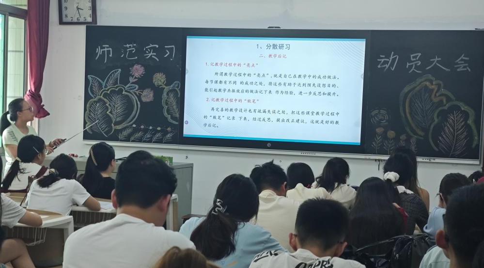 会上,武芸老师首先从安全、纪律、机遇、形象、合作、锻炼6个方面提出了实习总要求。她表示,实习生将分赴多所中学,开展为期3个月的教学实践,内容包括协助完成生物课程教学、参与班级管理、组织学生活动等。她强调,实习生须严格遵守实习学校规章制度,注重师德师风、仪容仪表和沟通礼仪,展现良好教师职业素养,“以准教师标准要求自己,注重课堂互动与反思”。返校后保质保量提交实习日志、反思报告及班级管理案例等。