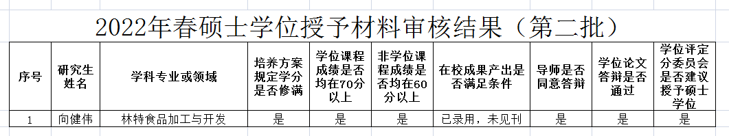 经研究生本人申请,导师同意,培养单位资格审查,学位评定分委员会审议,学科建设与学位管理办公室形式复核,学位论文学术不端行为终检等程序,共有向健伟等1人完成硕士学位材料提交工作。现对材料审核结果进行公示,具体见附件。