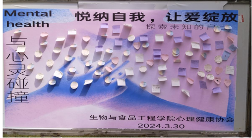 本网讯(见习通讯员 邓震宇/文 徐郡 卢立渊/图)为进一步加强心理健康工作,帮助学生了解自我,悦纳自我,培养学生积极心理品质,3月30日上午10点,我院心理健康协会在生物与食品工程学院门口举办“悦纳自我,让爱绽放”主题心理健康活动。
