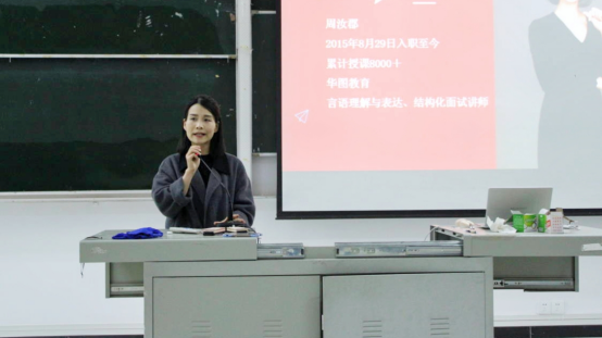 讲座伊始,周汝郡将讲座内容浓缩为四个问题,分别是:当前就业形势、你想做什么、为什么考公考编以及如何备考。周汝郡指明其中最重要的是“你想做什么”,在疫情下大学生所面临的就业压力越来越严峻,解决好就业问题就是解决人生最重要的问题之一。随后,她就这四个部分作更详细介绍。她列出四种大学生毕业所选择的道路:直接找工作、继续升学深造、考公考编、创业。并列出了每条路需要面对的问题带同学们剖析。结合当下现实环境,她着重强调了考公考编的优势,同时也是极具竞争力的岗位,由此她提醒大学生要对公务员机制体制深入了解,更要把握备考方向,科学地进行备考。