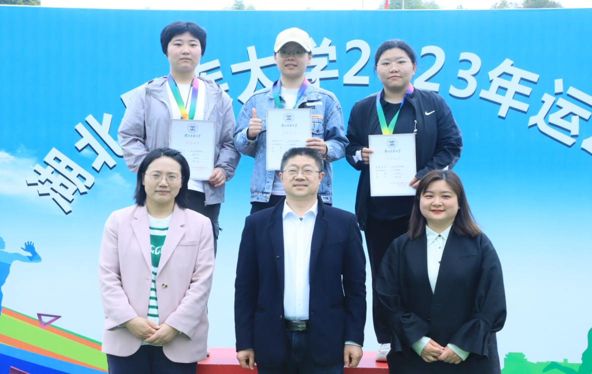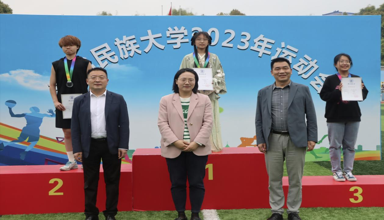 校团委书记吴珊老师为女子一百米项目冠军秦静雯同学(二排中)颁奖