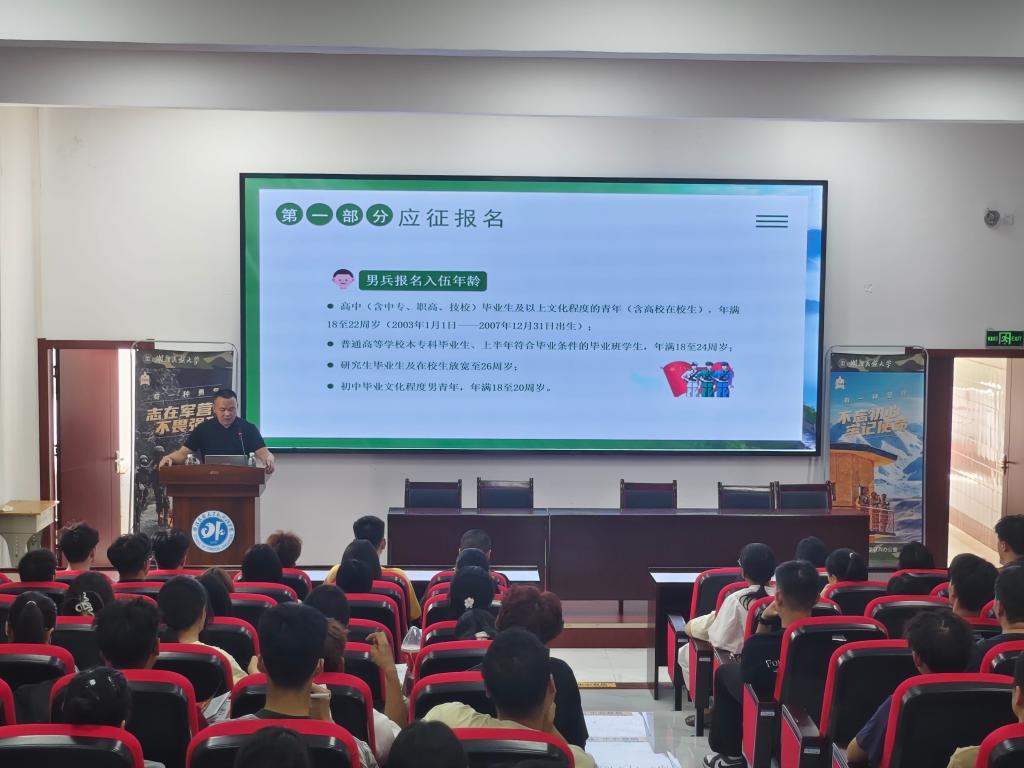 为积极响应国家征兵号召,鼓励优秀大学生投身军营,2025年6月5日下午,365电子娱乐官方网站人民武装部联合恩施市人武部在文汇楼6402报告厅召开2025年秋季征兵宣传动员大会,恩施市征兵办公室主任宋勇、恩施市征兵办公室体检中心医生王晓玲、365电子娱乐官方网站武装办公室负责人,各学院负责征兵的老师、意愿入伍的学生共150余人参加动员大会。
