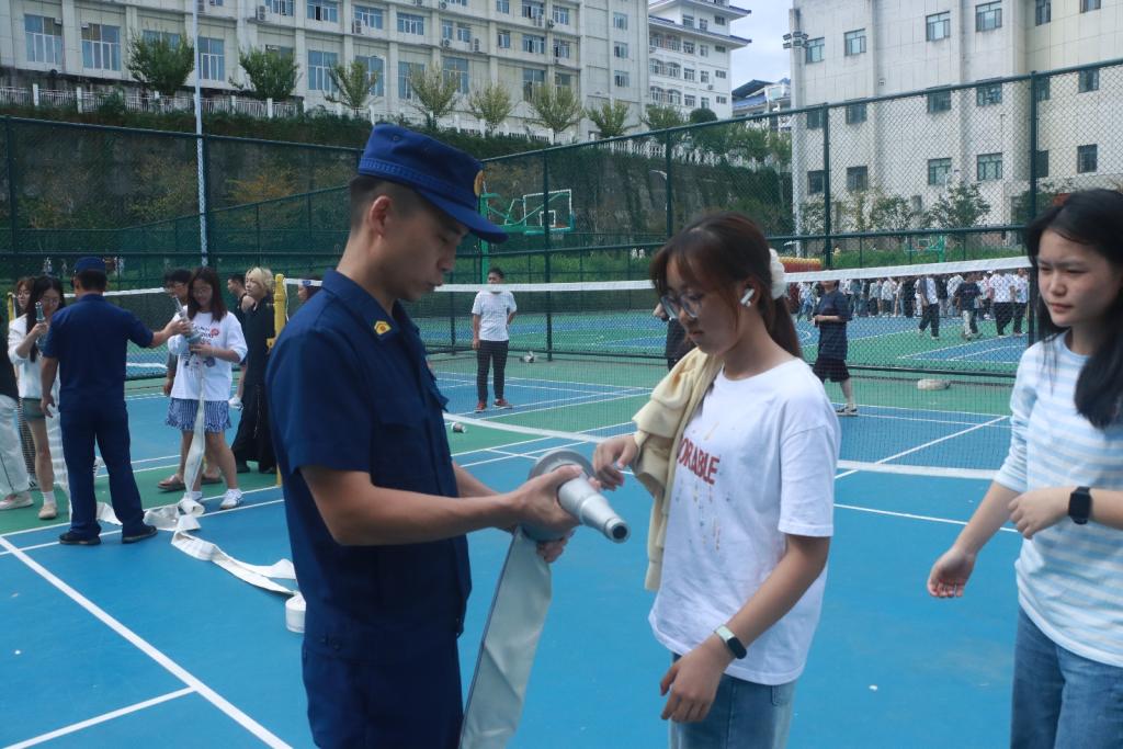 随后,消防员又带领新生们学习消防水栓的拼接与使用。消防员先进行了示范,讲解了水带、水枪与消火栓的连接要点以及开启消火栓的操作流程。新生们分组进行实践,大家相互协作,认真完成水带的拼接,感受消防水栓在灭火时的强大作用,进一步深化了对消防设施的认识。