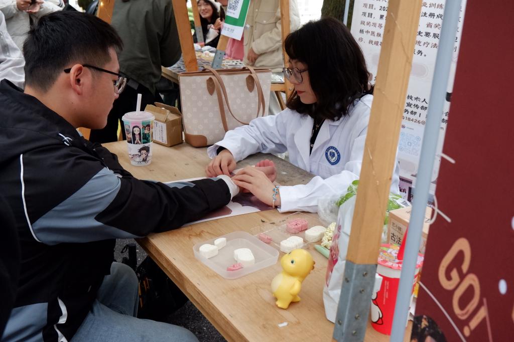 在养生青年专享区,小巧便携的茶包不仅设计贴心,冲泡后更在寒湿天气中送来阵阵暖意。此外,还有富含地方特色的恩施藤茶制成的茶饼,以及创业团队自主研发的水果富硒饮料,因其具有抗氧化、改善睡眠、延缓衰老等多重功效,吸引了大量师生驻足选购。同时,也有把脉问诊活动,便于师生及时调整。