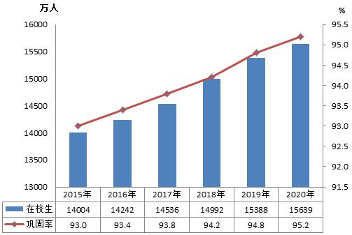 全国共有义务教育阶段学校21.08万所,招生3440.19万人,在校生1.56亿人,专任教师1029.49万人,九年义务教育巩固率[5] 95.2%。