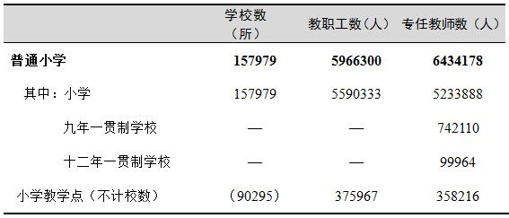 全国共有普通小学15.80万所,比上年减少2169所,下降1.35%。另有小学教学点9.03万个,比上年减少0.62万个。招生1808.09万人,比上年减少60.95万人,下降3.26%;在校生10725.35万人,比上年增加164.12万人,增长1.55%;毕业生1640.32万人,比上年减少7.58万人,下降0.46%。小学学龄儿童净入学率[6] 99.96%。