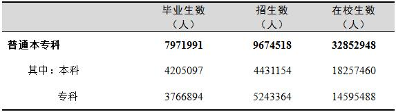 普通本专科招生967.45万人,比上年增加52.55万人,增长5.74%;在校生3285.29万人,比上年增加253.77万人,增长8.37%;毕业生797.20万人,比上年增加38.67万人,增长5.10%。另有五年制高职转入专科招生46.28万人;专科起点本科招生61.79万人。