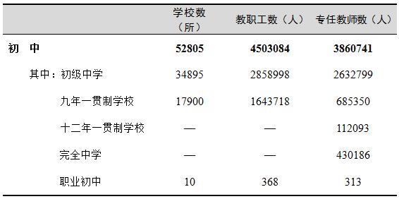 全国共有初中5.28万所(含职业初中10所),比上年增加390所,增长0.74%。招生1632.10万人,比上年减少6.75万人,下降0.41%;在校生4914.09万人,比上年增加86.95万人,增长1.80%;毕业生1535.29万人,比上年增加81.20万人,增长5.58%。初中阶段毛入学率[4] 102.5%。