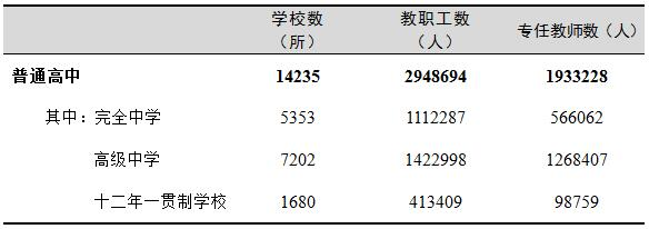 普通高中教职工294.87万人,比上年增加11.50万人,增长4.06%;专任教师193.32万人,比上年增加7.40万人,增长3.98%。生师比12.90:1;专任教师学历合格率98.79%,比上年提高0.17个百分点。