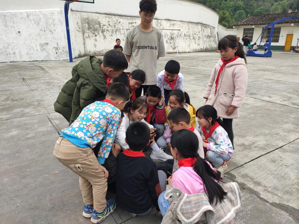 朱砂溪是外国语学院、信息工程学院、体育学院社工部的支教基地,坐落于芭蕉的一个偏僻小山村里,6个班共一百多名学生。朱砂溪小学课堂设备较完善,但教师资源缺乏,留守儿童居多,学生对外界的了解匮乏。经过一个多小时车程,支教团队到达朱砂溪小学。活动伊始,各院志愿者准备充分,上课生动有趣,学生们也积极投入课堂学习,课堂氛围分外活跃,孩子们每个人的脸上都洋溢着快乐的笑容。各位志愿者根据各班实际开设形式多样新奇而富有蕴意的主题课堂。课间,孩子们和志愿者打成一片。活动中,志愿者们表现出了极高的工作热情,展现出奉献的魅力。“学为人师,行为世范”,志愿者用行动践行了“师者”的责任。活动结束后,孩子们和志愿者依依不舍地道别。