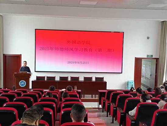 时间:2025-09-28 编辑:办公室 点击:为深化新时代教师队伍建设,外国语学院于9月25日召开全体教职工大会,围绕师德师风建设主题开展专题学习教育。会议由学院党总支书记罗成富主持。