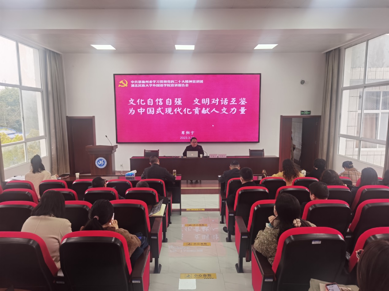 为深入学习宣传贯彻党的二十大精神,推动党的二十大精神在学院落地落实形成生动实践,学院邀请学校党委委员、党委宣传部常务副部长罗翔宇教授为全体教职工作二十大精神专题宣讲,罗翔宇以《文化自信自强,文明对话互鉴,为中国式现代化贡献人文力量》为题,以“中国式现代化”为切入点,通过中国共产党国际形象网宣片导入,深入浅出地讲解了中国式现代化的丰富内涵,同时立足推进文化自信自强,结合外国语学院学科特色,从学理性与文化传播角度阐释了如何讲好中国故事,传播中国声音,展示可信、可爱、可敬的中国形象。