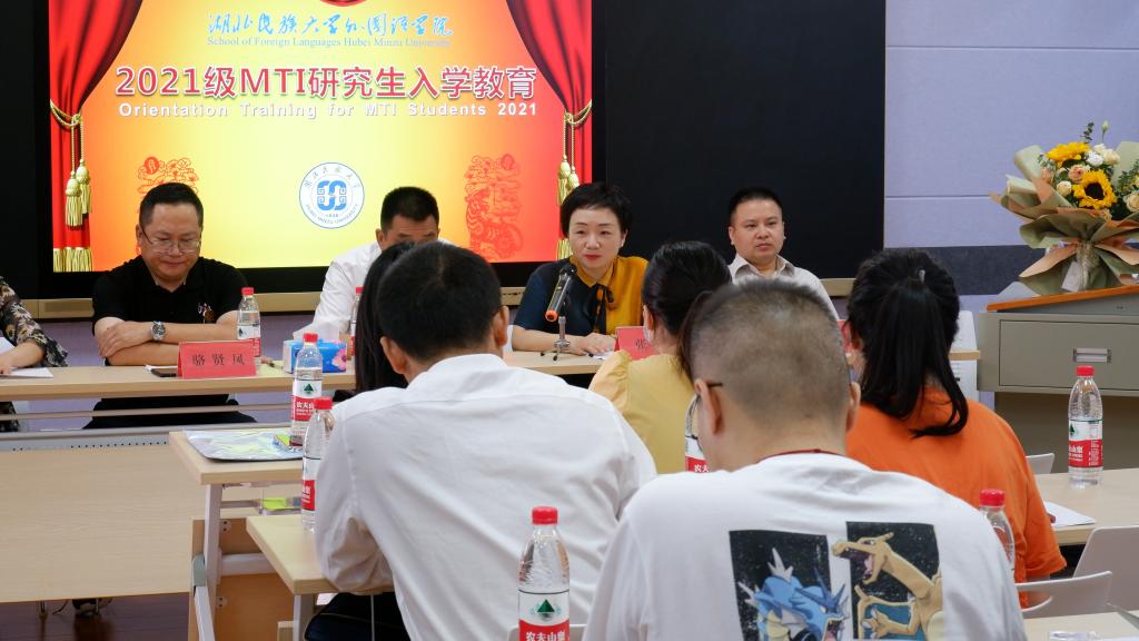 911日,外国语学院2021MTI研究生入学教育活动在文汇楼多功能录播室举行。学院院长骆贤凤、党总支书记周代明、副院长陈斌、副院长张婷,学科建设科科长陈海兵以及MTI教育中心刘孔喜、谭雪莲、刘波等领导老师参加。副院长陈斌主持活动。