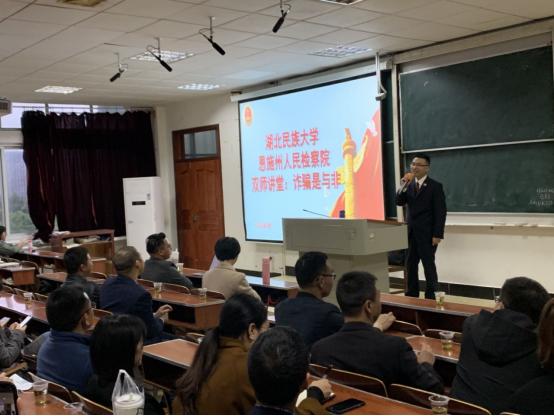 4月21日晚,以《诈骗罪的是与非——以向某诈骗罪为例》为主题的第五期“双师同堂”讲座在德智楼9b410教室举办,我院邀请恩施州人民检察院第二检察部主任周晓为担任主讲人,我校刑事法治研究所所长黄继坤任主持人,有多名检察官、律师到场旁听、互动。