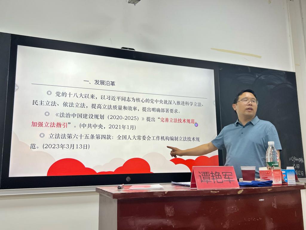 为进一步深化教育教学改革,贯彻“双师同堂、项目引领、合作学习”理念,6月12日,恩施州人大常委会法制工作委员会副主任谭艳军博士受邀来到《立法理论与实务》课堂讲学。本次课由课程主讲人、法学专业负责人冉艳辉教授主持。