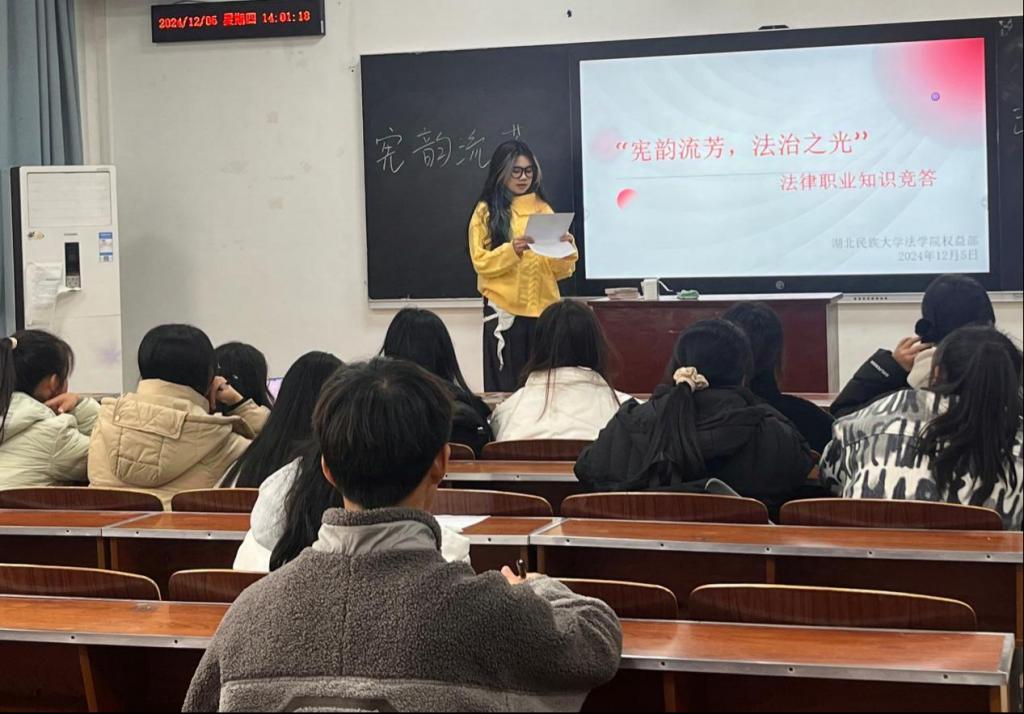 本网讯(记者 夏依果/文  谭血玲/图)12月5日,我院于德智楼9B305教室举行“宪韵流芳,法律之光”宪法知识竞答活动。本次活动由我院权益部副部长聂静怡任主持人,30余名本科生到场参赛。