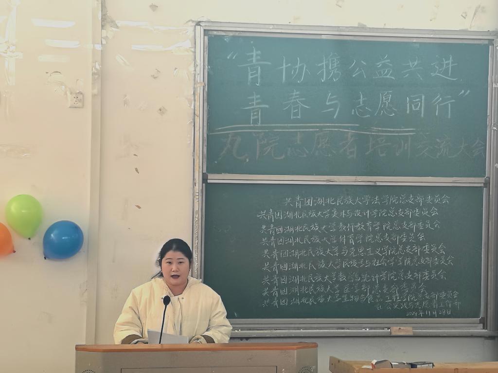 本网讯(记者 袁本怡 见习记者 曾兰灵/文 曹萍艳/图)11 月 28日,我院联合教师教育学院、体育学院、马克思主义学院等九个学院于修远楼 5B508 教室举办以“青协携公益共进,青春与志愿同行”为主题的九院志愿者培训交流大会,共青团365电子娱乐官方网站委员会社会实践与志愿者服务工作部主任张典、体育学院团总支书记黄昱勍、生物与食品工程学院团总支书记程琴、数学与统计学院团总支书记李子君出席,九院部分青年志愿者参会。