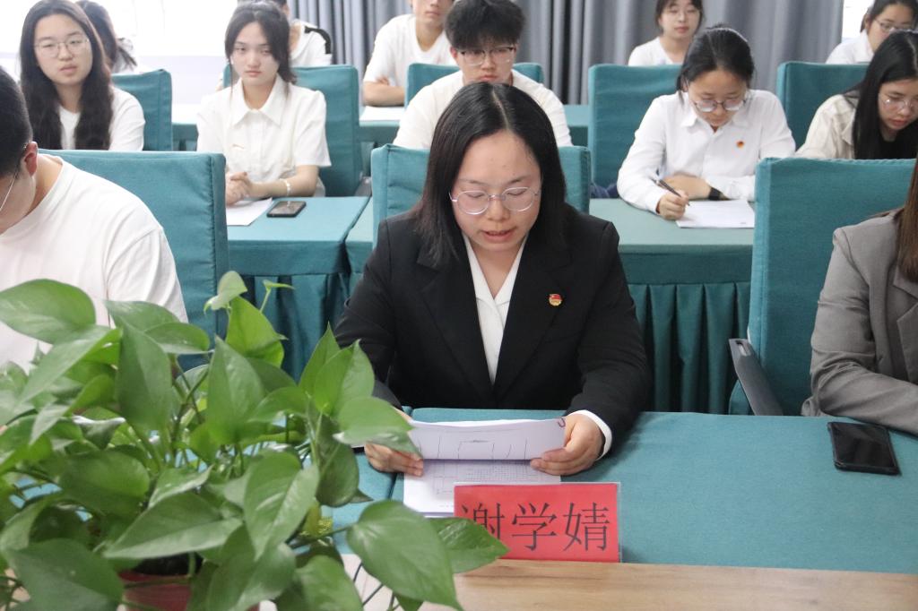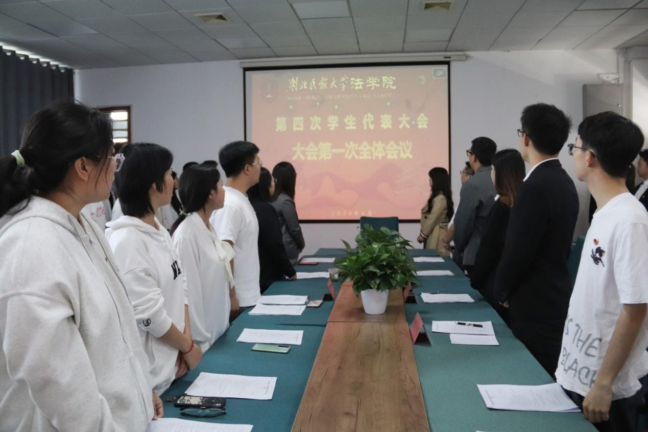 本网讯(记者 陈咏琪/文 黄煜基/图)2024年4月25日,365电子娱乐官方网站法学院第四次学生代表大会第一次全体会议暨开幕式在我院在9B4314教室举行,校团委副书记与校学生会秘书长彭弥、法学院党总支副书记黄晓波、学生科科长阙嘉苗、学生党支部书记彭阳出席开幕式,我院36名学生代表参会,我院团总支书记谢学婧担任主持人。