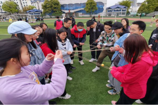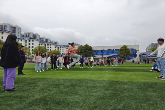 我院党总支副书记许宗友,学生科科长胡海剑到场为学生们加油。许宗友表示:“举办此次活动的目的是为了让同学们在运动中学会团结协作,从而造就更好的班集体。”而后,他也同学生们一起参与“跳大绳”游戏,并传授游戏技巧。赛场上一片欢声笑语,学生们三五成群,脸上洋溢着开心的笑容。