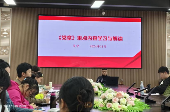 11月10日,美术与设计学院吴宇老师与各发展对象共同学习研究《党章》重点内容。他深入浅出地解读党章的重要意义,从党章的发展历程讲起,展现其在不同历史时期的演变,让大家明白党章是与时俱进、不断完善的。通过课堂讲授为各位发展对象进一步理解党的纲领、坚定理想信念打下坚实基础,推动他们向着成为优秀党员的目标大步迈进。