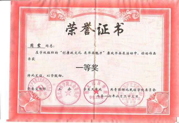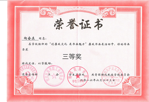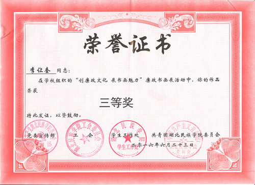 在党委宣传部、校工会、学生工作处及校团委共同举办的“创廉政文化展书画魅力”书画展中,周震老师荣获一等奖,高志爽老师荣获二等奖,向会立和李让奎老师获三等奖。