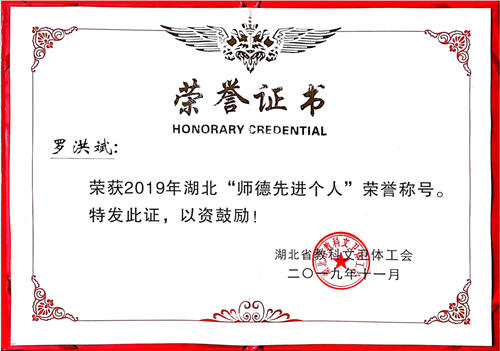 我校教师罗洪斌荣获2019年湖北省“师德先进个人”荣誉称号