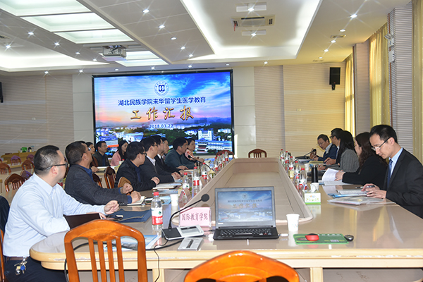 27日上午,学校在行政楼三号会议室举行汇报会,副校长邓磊致欢迎辞并介绍了365电子娱乐官方网站和医学留学生教育基本情况。专家组组长樊立洁教授就此次调研的目的、性质和具体工作安排等情况作了说明。随后专家组一行听取了国际交流合作处副处长罗永健所做的专题汇报。学校党办院办、学工处、教务处、保卫处、医学院、临床医学院、国际教育学院等部门负责人和教师代表参加了汇报会。