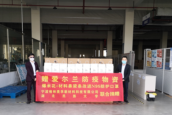 2020年3月,我校联合宁波格林美孚新材料科技有限公司以实际行动积极支援国际社会的防疫工作,目前已向爱尔兰、巴基斯坦、剑桥大学捐赠爆米花材料鼻梁条改进KN95口罩万余个以及数百个护目镜,后续还将向有需要的国家地区捐赠防疫物资。