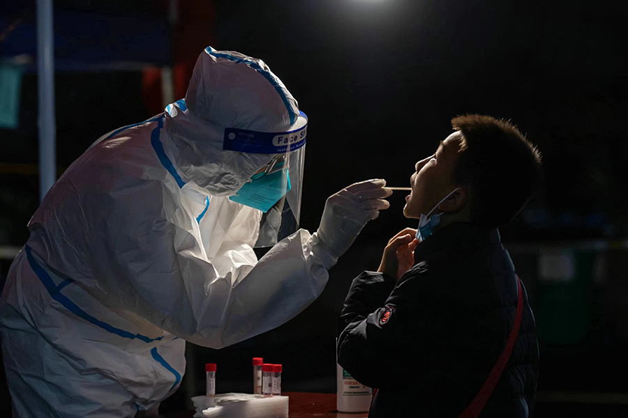 早上6点,志愿者在解放路社区为市民进行核酸采样