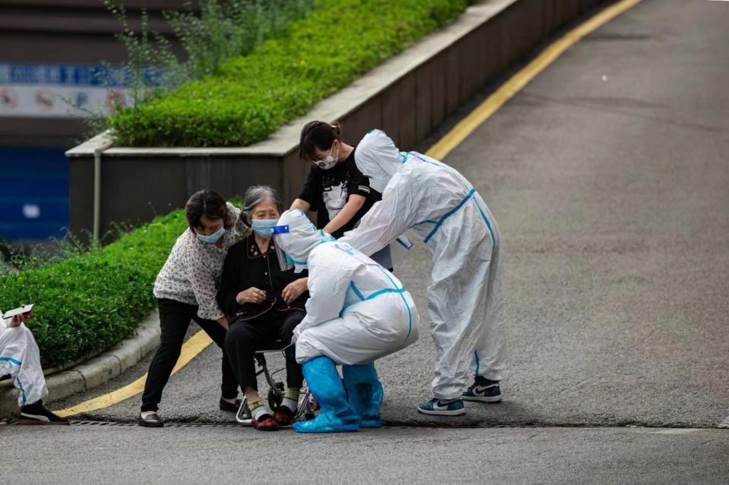 在六角亭片区,志愿者迎上前帮助行动不便的老人到采样点