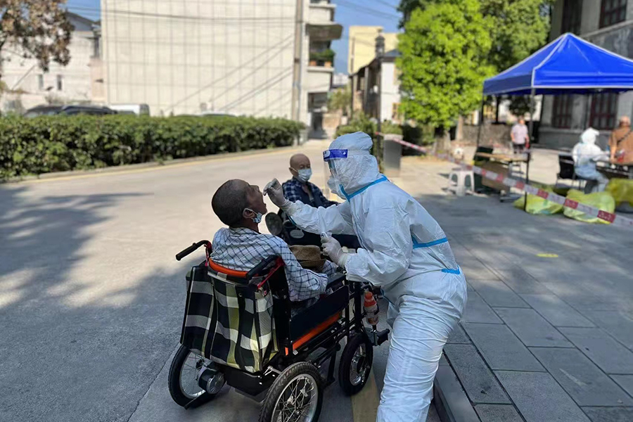 志愿者走到坐轮椅的老人面前,为他们进行核酸采样