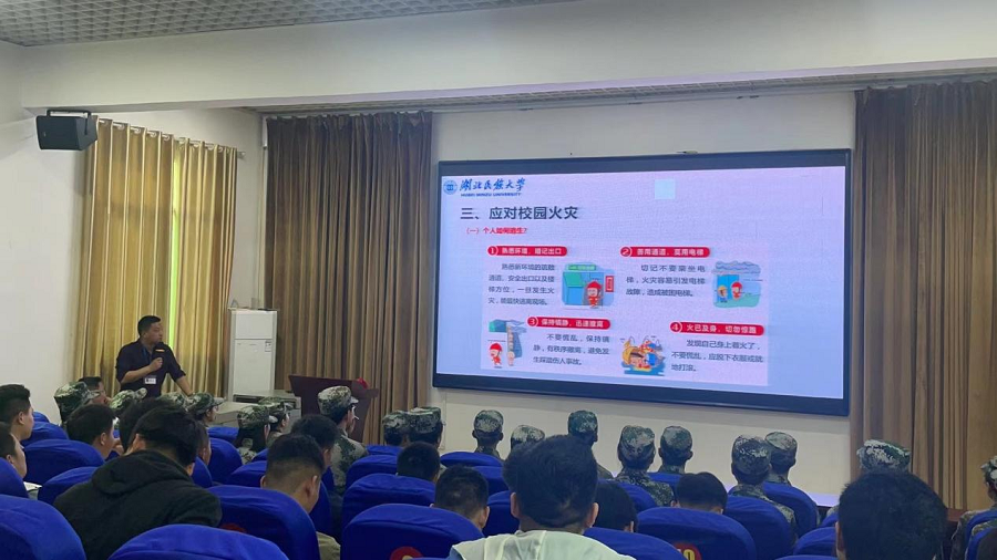 保卫处胡海剑进行知识宣讲。他详细讲解了消防相关法律法规,对身边消防安全隐患的发现与消除、发生火情如何处置以及常见消防设施设备的功能进行了梳理。