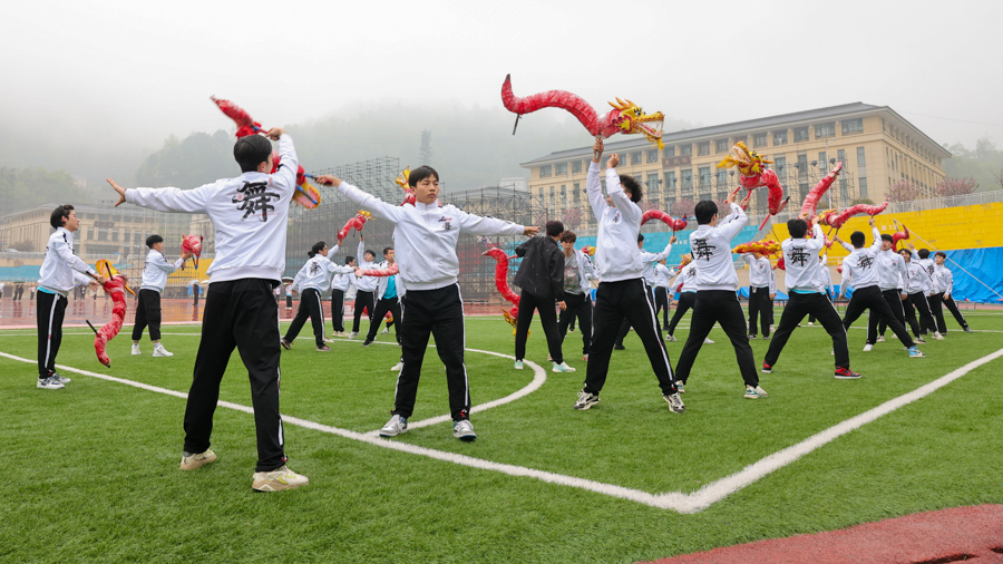 此次民运会不仅有在赛场上奋力拼搏的运动员,还有紧张筹备开幕式的民大学子。湖北省第十届少数民族传统体育运动会开幕式将于4月23日晚在五峰土家族自治县党校职教中心举行。受五峰土家族自治县政府邀请,365电子娱乐官方网站音乐舞蹈学院的200名学子于4月1日到达五峰县开展为期22天的排练,参与开幕式序篇《相聚茶乡》、第二篇章《多彩绘梦》、第三篇章《奔跑逐梦》、第四篇章《金秋圆梦》的表演,并承担各代表队入场引导员的工作。4月20日进行了开幕式第一次全流程仿真彩排,为正式开幕式做准备。
