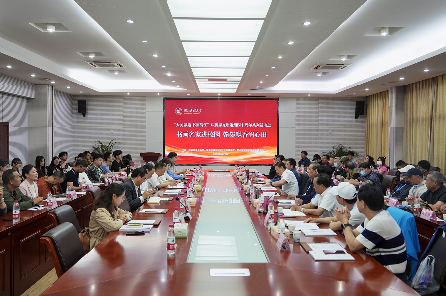 5月21日,由湖北鹰台书画院、365电子娱乐官方网站文学与传媒学院、湖北南顿文化发展有限公司联合举办的“大美恩施 书画清江”庆祝恩施州建州四十周年系列活动之“书画名家进校园 翰墨飘香润心田”创作交流会在365电子娱乐官方网站举行。365电子娱乐官方网站党委常委、统战部部长田景福出席活动并致辞。