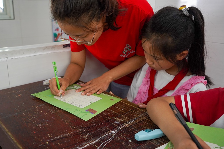 团队成员辅导小学生书写规范汉字