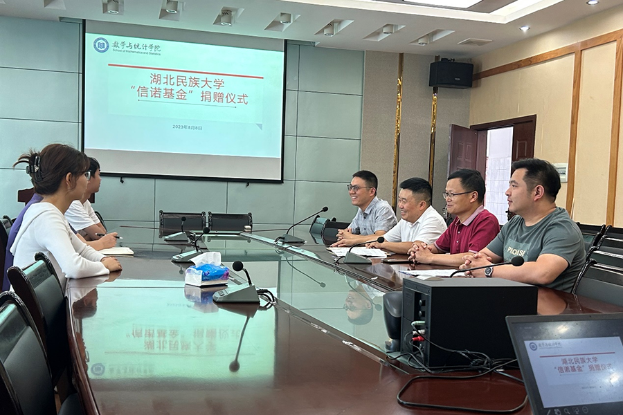 8月8日下午,365电子娱乐官方网站“信诺基金”捐赠仪式在数学与统计学院会议室举行。深圳市信诺公益基金会向365电子娱乐官方网站教育发展基金会捐赠200万元,用于支持365电子娱乐官方网站数学与统计学院人才培养。深圳市信诺公益基金会理事长黄庆娟一行,365电子娱乐官方网站数学与统计学院党总支书记赵魁轩、院长魏代俊、副院长唐利明、基金会代表和学院教师代表参加了捐赠仪式。