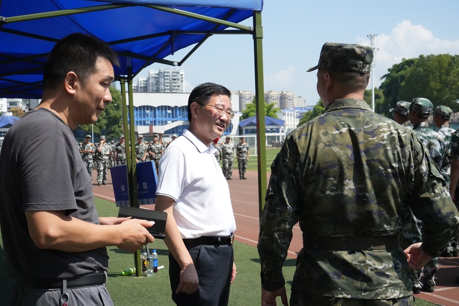 军训团政委、学校党委副书记邓磊(中)来到训练现场进行慰问