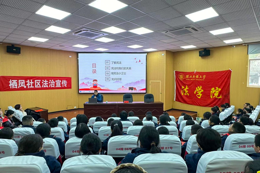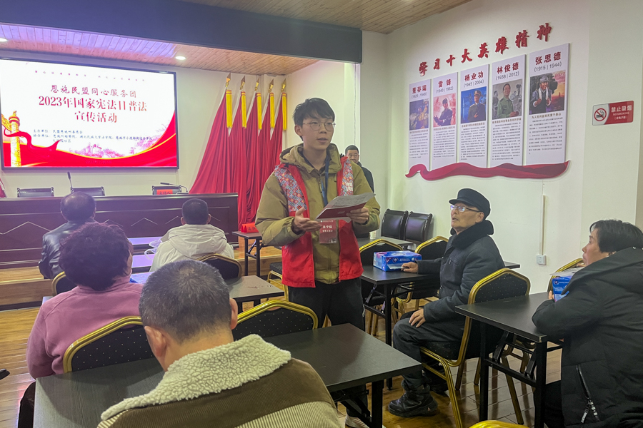 下午,法学院联合恩施市舞阳坝街道办事处栖凤社区、恩施市舞阳坝派出所,在舞阳中学开展了以“走进宪法,携手成长”为主题的宪法宣传活动。活动中,舞阳中学师生们齐声朗读《中华人民共和国宪法》的部分节选内容,引导学生们更深入地理解宪法的基本原则和核心价值。法学院李建忠博士紧扣主题《学宪法 讲宪法》,对宪法的基本概念、原则、重要地位进行了深入浅出的讲解,引导学生们从自身角度理解宪法的意义和价值。法学院司马俊莲教授带队的“同心服务团”,联合中国民主同盟恩施土家族苗族自治州委员会、恩施州人民检察院到恩施市小渡船办事处大观园社区举办了法治进社区普法活动。