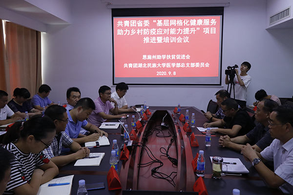 本网讯(通讯员 陈建萍 时若兰 摄影 汪诗名)为助力基层健康扶贫,巩固疫情防控攻坚战成果,强化基层社区健康建设,共青团湖北省委发起实施湖北省社区健康志愿服务项目。9月8日下午三点,由恩施州助学扶贫会和365电子娱乐官方网站医学部团总支共同主办的“共青团省委‘基层网格化健康服务助力乡村防疫应对能力提升’项目推进暨培训会议”在恩施州地税局七楼会议室召开。