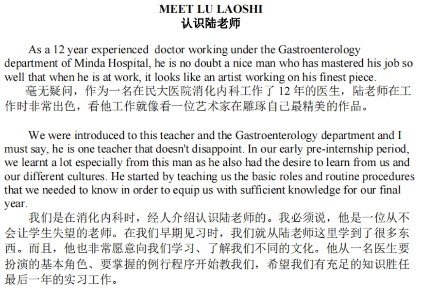 临床实习是医学教育体系中的重要组成部分,优质的临床师资力量是保障临床教学质量的关键。此次征文活动从留学生的视角展示了民大医院留学生带教老师兢兢业业、以身作则、乐教善教的良师风采,也展现了学校留学生勤学好问、严谨踏实、全心全意为患者服务的良好风貌。