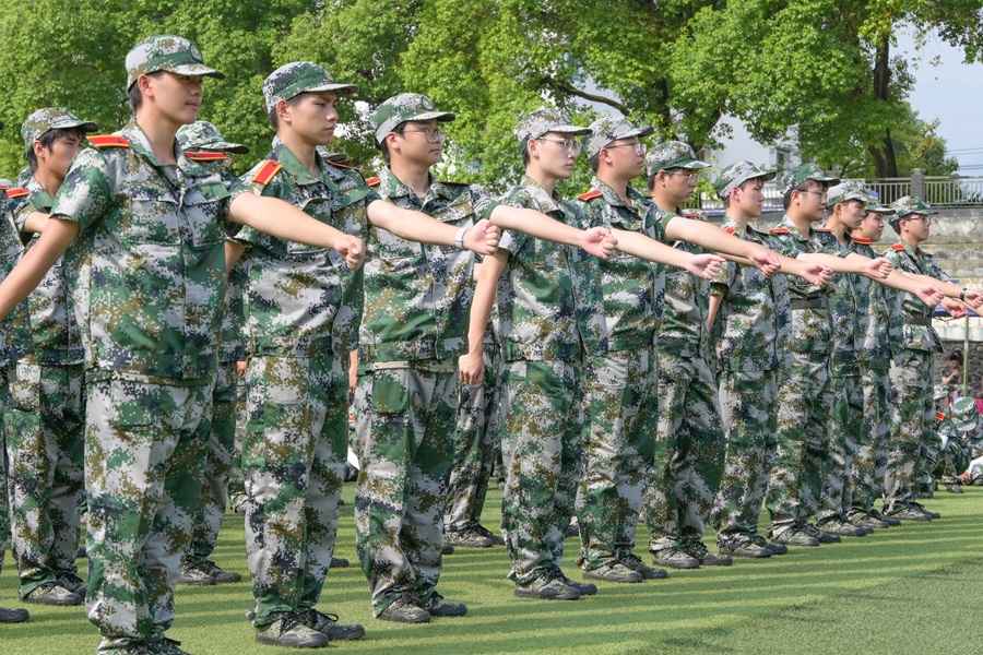 炎炎夏日,学生从站军姿、稍息、立正、跨立、停止间转法等基本项目开始学起。每一个动作,教官都亲自分解示范与指导,从摆臂到踢腿,从握拳到收脚,都要通过教官严格把关。“抬头挺胸,收腹,目视前方,下颚微收,五指紧贴裤缝,身体微微前倾”,教官的口令,如雷贯耳,每一次动作的纠正,都在向标准看齐,学生衣裳尽湿但仍斗志昂扬。
