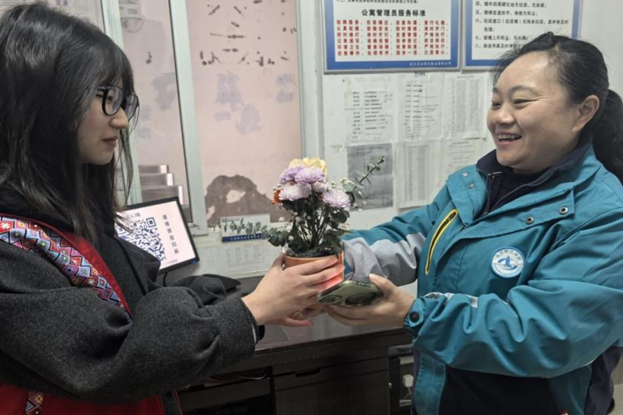 数学与统计学院志愿者为宿管阿姨送鲜花