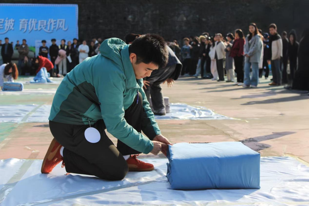 首先进行的是叠军被决赛。来自数学与统计学院、智能科学与工程学院及医学部等5个学院(部)的20名同学各显“神通”,娴熟地将被子铺平、压实、翻折、抠角、捏线,每一步都展现出扎实的内务基本功。在短短的5分钟比赛时间内,一床床普通的被子在同学们手中变成了棱角分明的“豆腐块”,整齐划一地展现在评委和观众面前。最终,林学园艺学院杜晨阳、教师教育学院杨义群、医学部汪春燕及数学与统计学院袁洁4名同学凭借出色表现斩获一等奖。