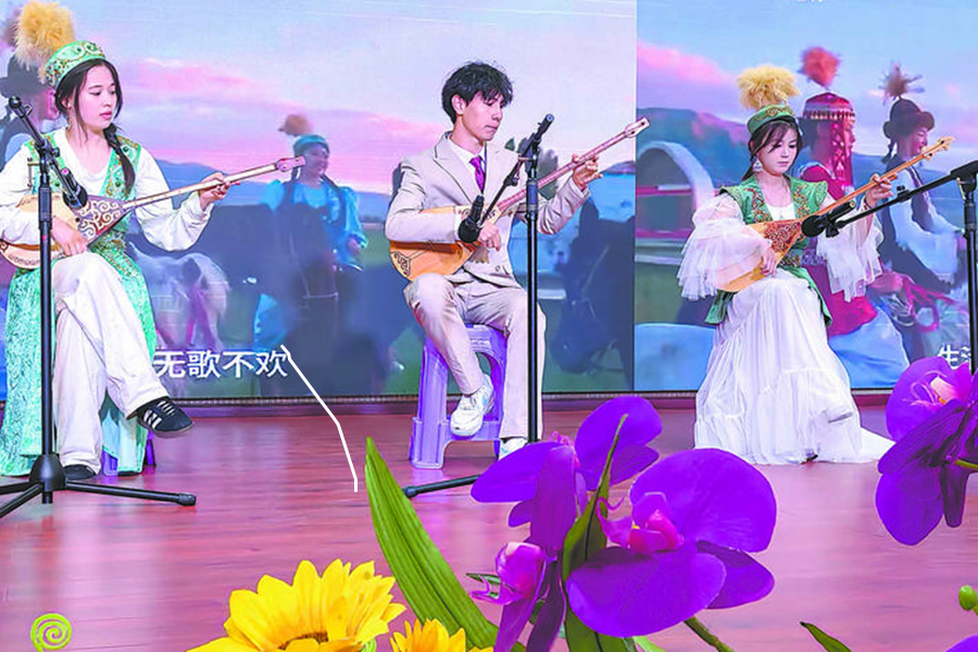 现场,天山脚下的石榴红、雪域高原的格桑香、武陵山区的连厢韵,在学生的歌舞中汇成了中华民族共同体的绚丽图景:土家《摆手舞》拉开序幕,冬不拉弹唱《民曲串烧》、快板《同仁堂》、舞蹈《连厢欢歌》等节目依次上演。土家族《嗬嗬吔》的豪迈与藏族民歌的悠远交织,地域特色文化通过舞蹈、美食、服饰等形式,彰显着中华多民族文化交融的魅力。