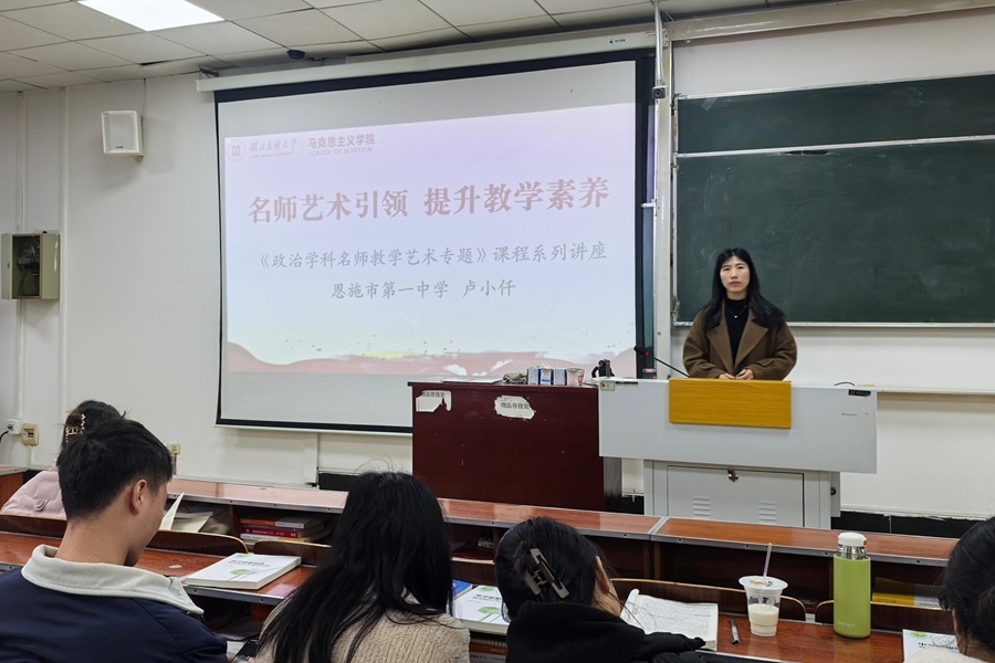 为充分发挥名师的示范、引领作用,提升师范生专业素养,3月5日到4月2日,马克思主义学院举办以“名师艺术引领 提升教学素养”为主题的《政治学科名师教学艺术专题》课程系列讲座。本次活动邀请恩施高中、恩施市第一中学的四位名师担任主讲人。马克思主义学院2022级思想政治教育专业全体学生参加此次讲座。